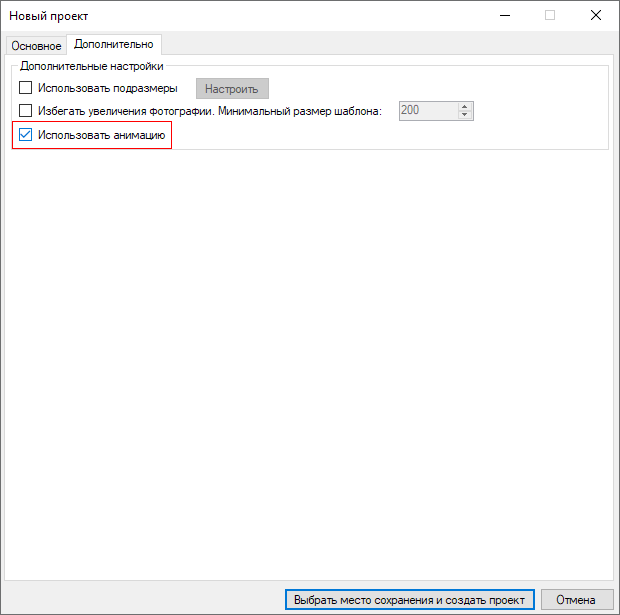 В открывшемся диалоговом окне установим тип проекта как Рамка, ориентацию — Квадрат. Во вкладке Дополнительно следует установить галочку напротив пункта Использовать анимацию.