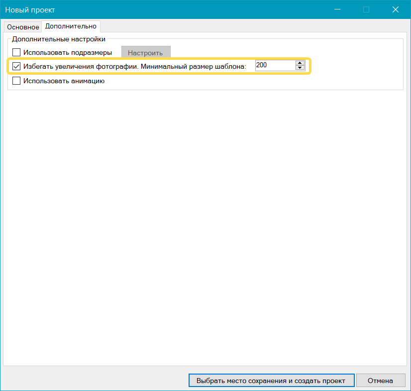 Если шаблон рассчитан на несколько фотографий, нужно указать, размер какой фотографии будет использован для автоматического изменения размера.