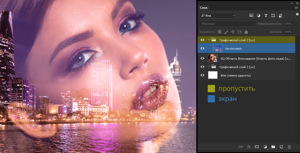 Блендинг Пропустить (Pass Through) применяется для групп слоев, чтобы указать, что режим наложения для них не задан. Это означает, что все графические слои в такой группе накладываются на остальные слои сквозным образом.