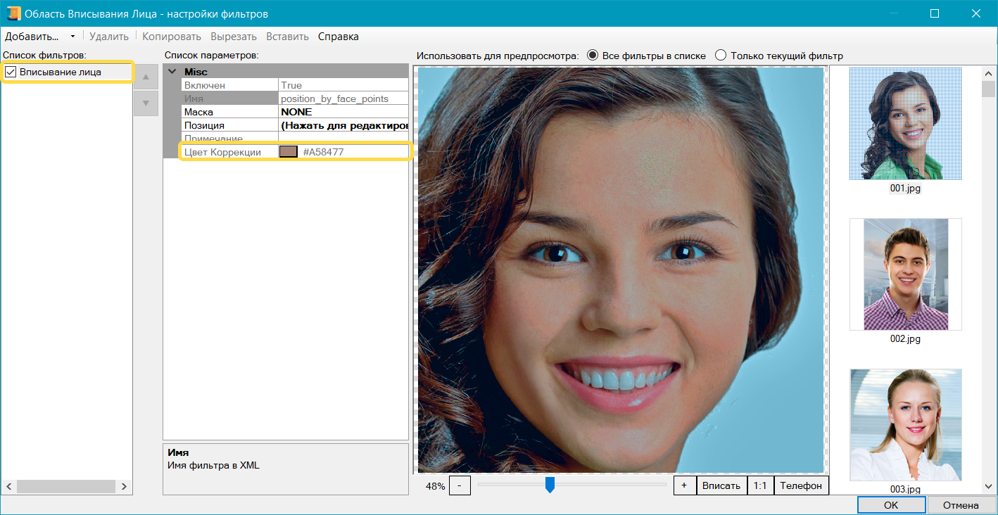 Перейдем к списку фильтров нашей Области вписывания лица и убедимся, что для фильтра Вписывание лица цвет коррекции был правильно распознан Конструктором шаблонов.