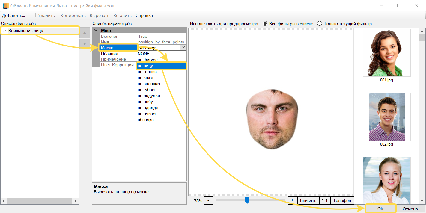 Перейдем к списку фильтров нашей Области вписывания лица. Затем для фильтра Вписывание лица напротив параметра установим значение . Эта опция позволит скрыть с пользовательских фотографий все, что выходит за пределы овала лица.