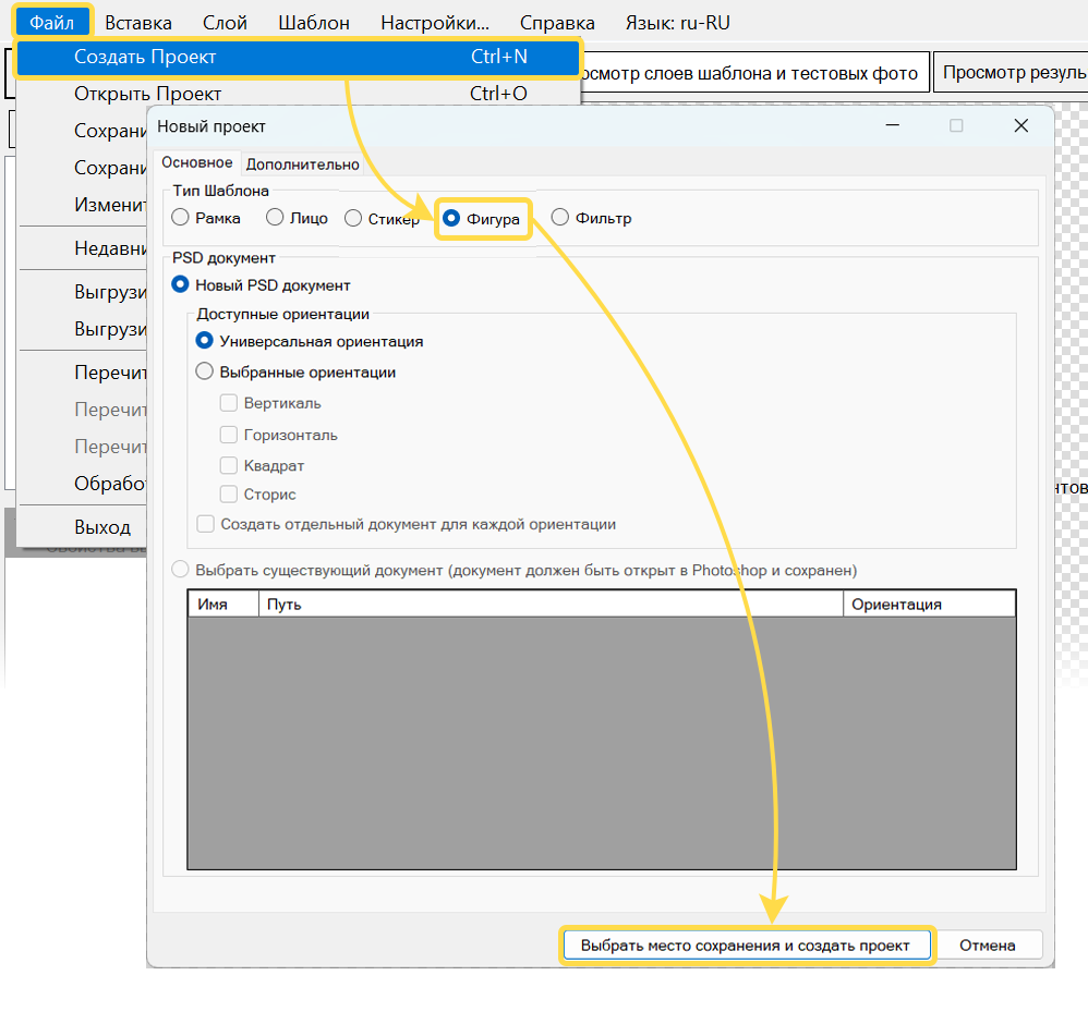 Рекомендуется заранее выбирать тип шаблона в соответствии с творческой задумкой. Впоследствии можно добавлять области вписывания разных типов, но важно учитывать, что размер итогового изображения зависит от выбранного типа шаблона.