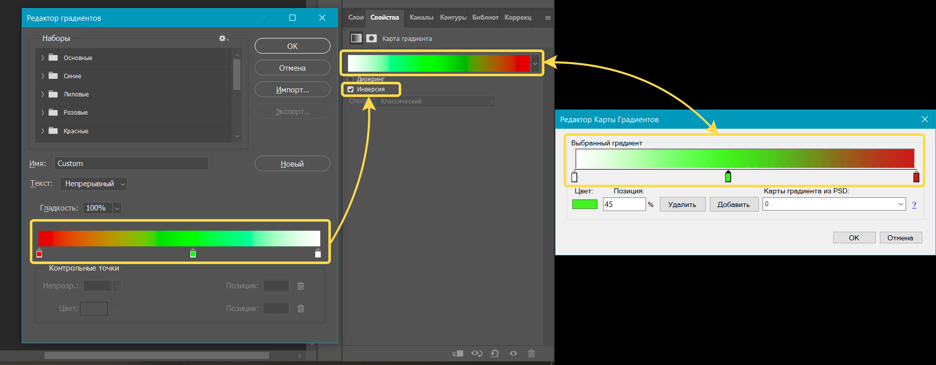 Помимо ручной установки параметров карты градиентов, можно использовать параметры корректирующих слоев из PSD-файла.