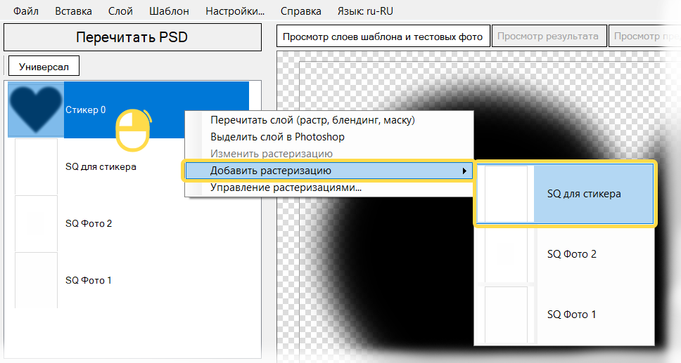 Вернемся в Конструктор шаблонов. Нажмем правой кнопкой мышки по области вписывания SQ Линии и нажмем , затем проверим результат на тестовом фото. Фиолетовые блики успешно реализованы.