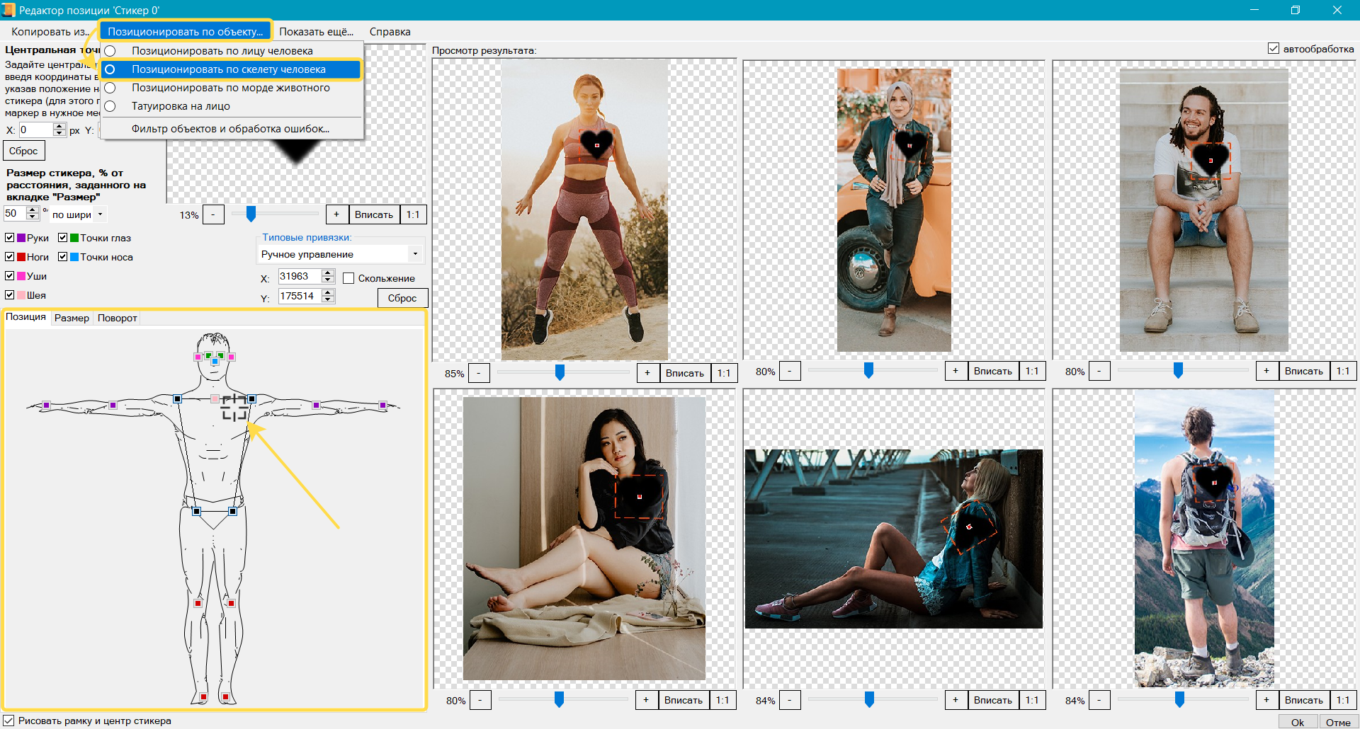 Спозиционируем область вписывания SQ Фото 2 на корпус фигуры. Для этого добавим динамическую позицию по области вписывания SQ для стикера: - По стикеру.