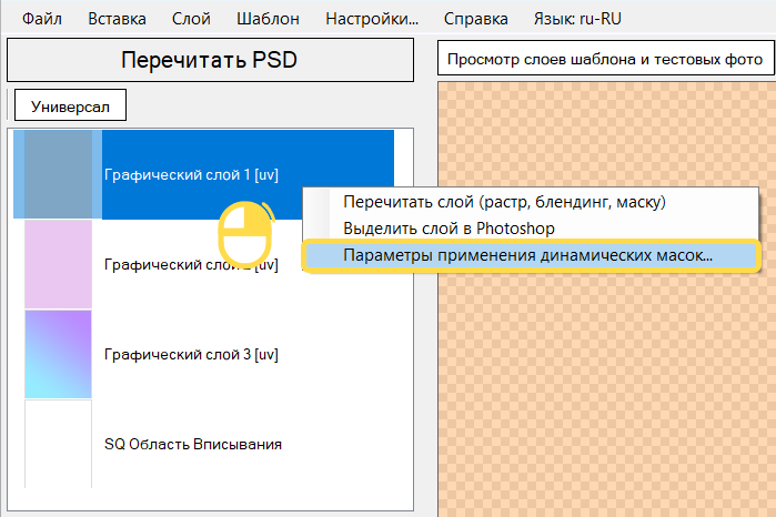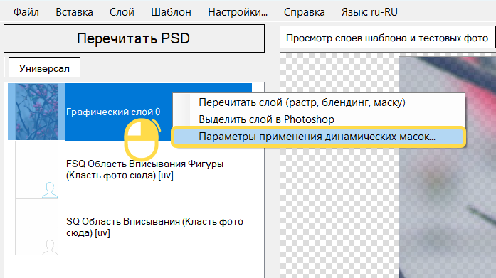 Вернемся в Конструктор шаблонов и нажмем Фиолетовый динамическую маску (кликнем правой кнопкой мыши по слою Фиолетовый и в выпадающем меню выберем ).