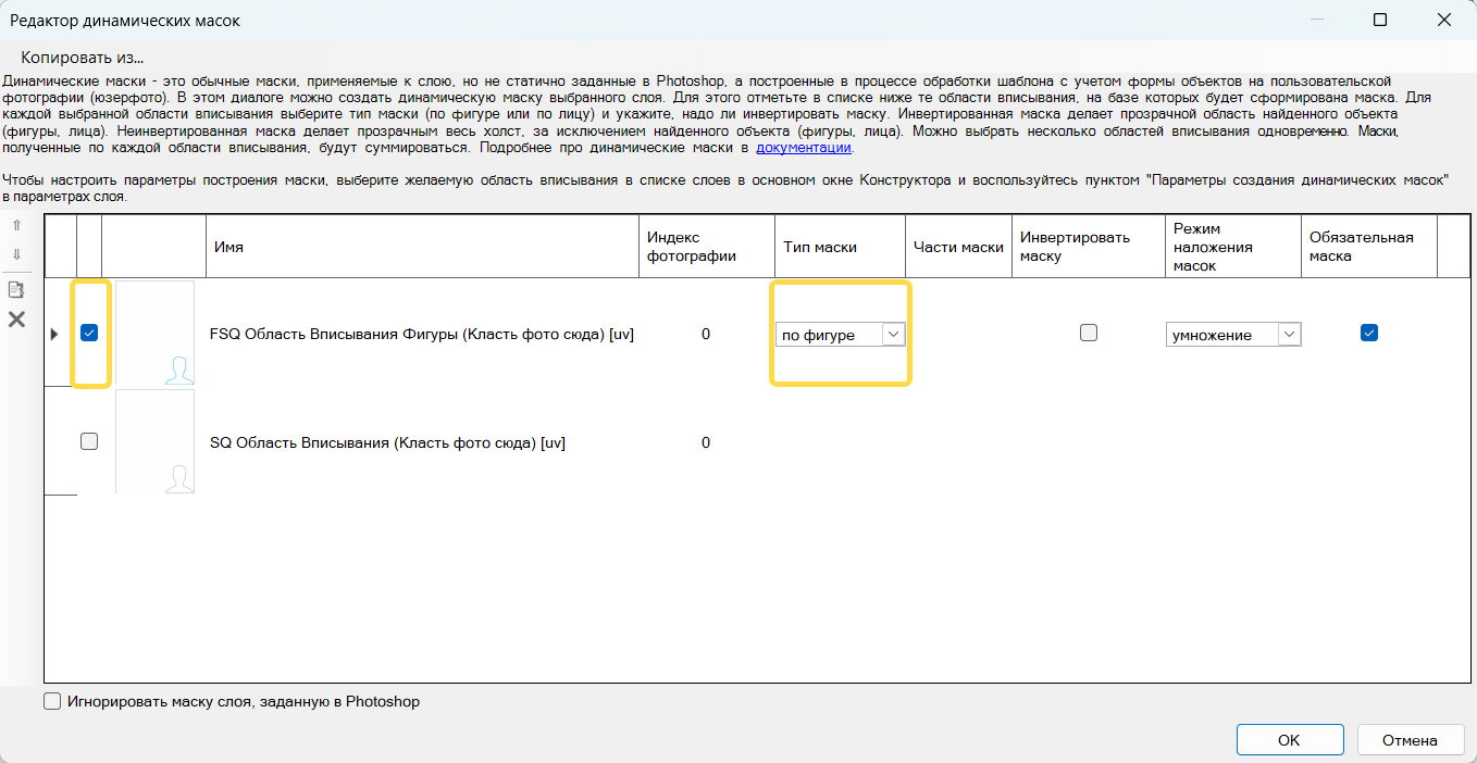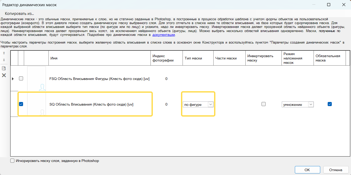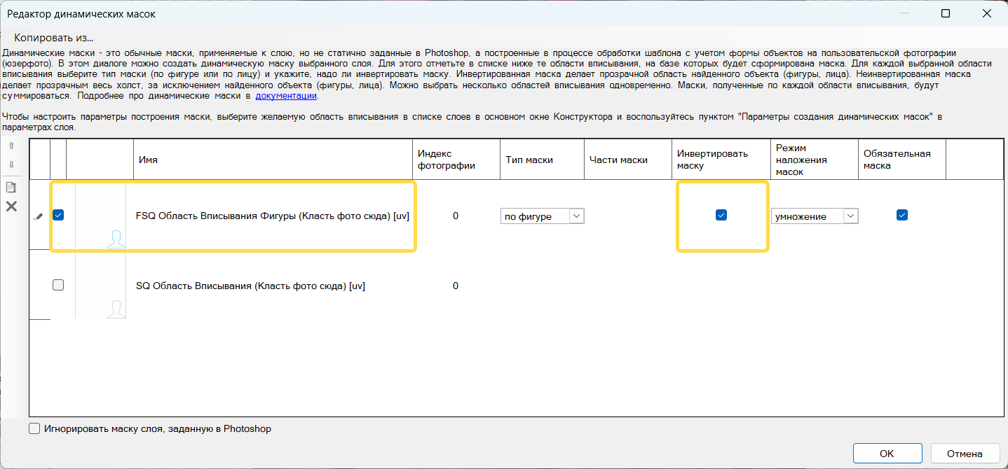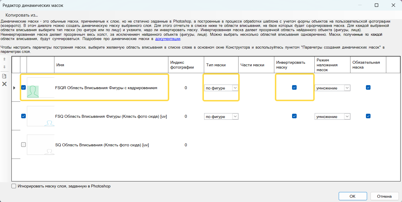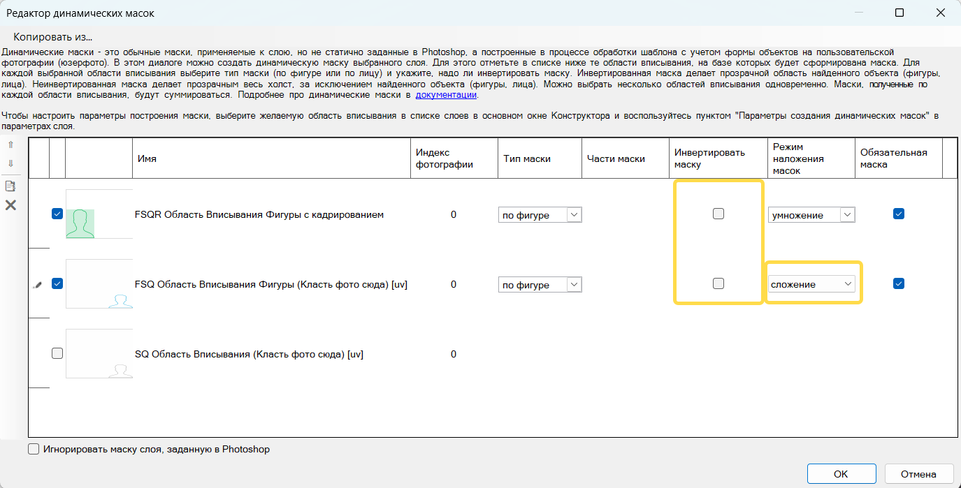 дляВ данном случае режим наложения масок для первой в списке области вписывания на результат не влияет. В нашем примере режим наложения масок для FSQR области вписывания фигуры можно не менять.