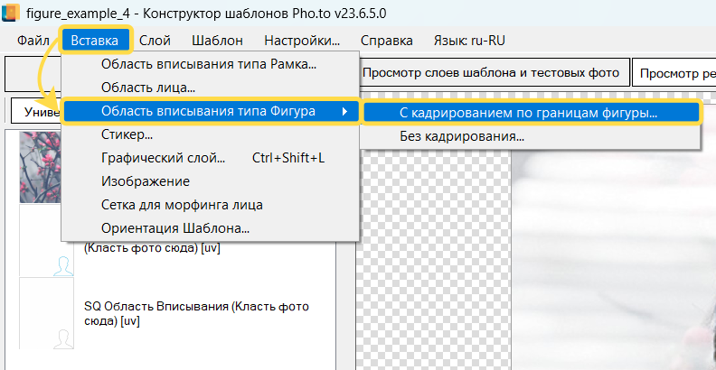 Перейдем в Конструктор шаблонов и нажмем индекс фотографии на одной из областей вписывания. Выберем слой SQ Фото 2 и в нижней панели изменим с на .