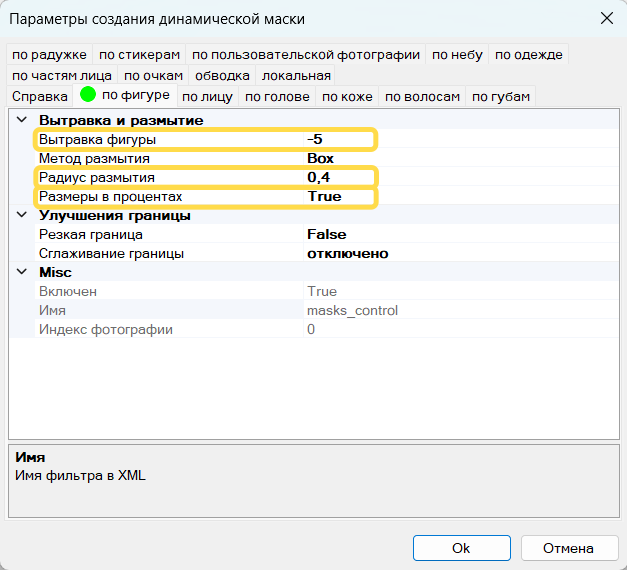 Для создания контура вокруг фигуры необходимо изменить значение вытравки для области вписывания, по которой строится маска. Подробнее о вытравке фигуры можно прочесть в соответствующем разделе документации по параметрам динамических масок.