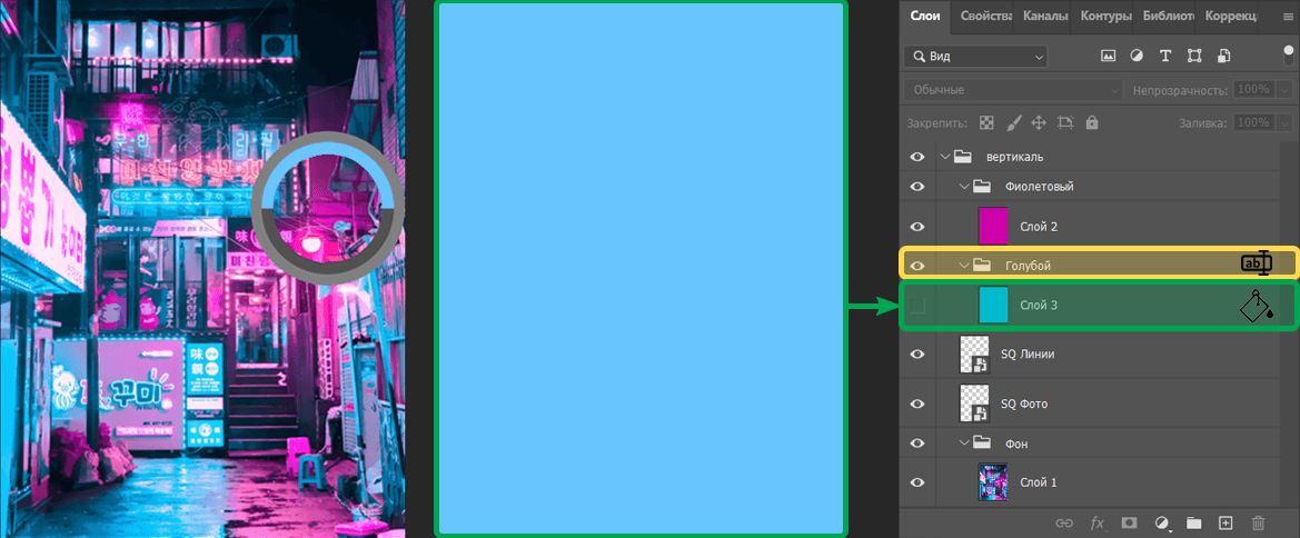 выберем на фоновом изображении образец фиолетового цвета (#af05a9) и заполним им слой при помощи инструмента .Повторим операции для подгруппы Графический слой 2: переименуем ее в Голубой и добавим новый слой с голубой (#7bc8ff) заливкой. Пока временно уберем видимость этого слоя.