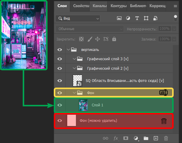 Удалим слой Фон. Подгруппу Графический слой 1 переименуем в Фон и добавим в нее наше фоновое изображение.