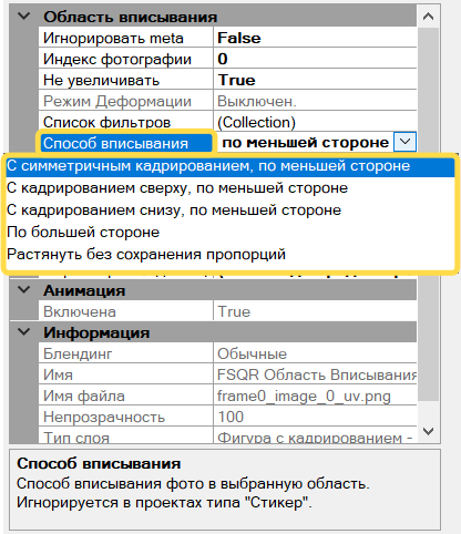 Настройка способа вписывания фотографий производится в свойствах выбранной области вписывания. Для этого нужно обратиться к блоку свойств, расположенному под списком слоев, и выбрать нужный вариант вписывания из выпадающего списка параметра .