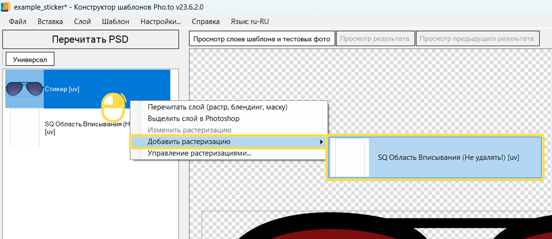 — Конструктор автоматически сгенерирует наборы графики для каждого заданного подразмера. При обработке пользовательского фото будет использован тот набор, который наиболее близок к размеру фото.Затем необходимо позиционировать стикер: В Конструкторе шаблонов нажмите на стикер правой кнопкой мыши и выберите в контекстном меню.