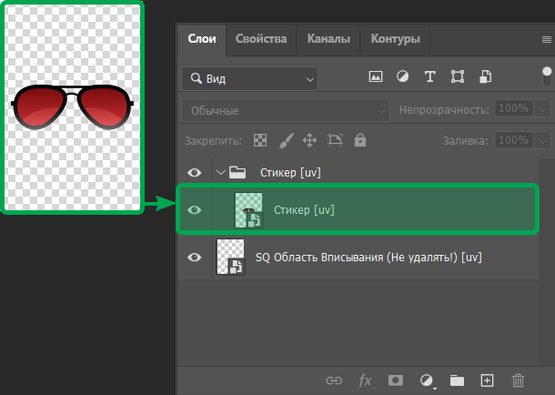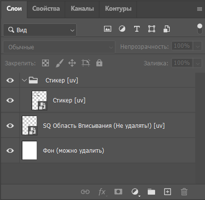Элементы, составляющие структуру шаблона должны быть вам знакомы - это Группа стикера со Cлоем стикера и специальный смарт-объект SQ Область вписывания. Поскольку мы создаем шаблон с универсальной ориентацией, группа стикера и смарт-объект располагаются на верхнем уровне слоев в PSD-документе.