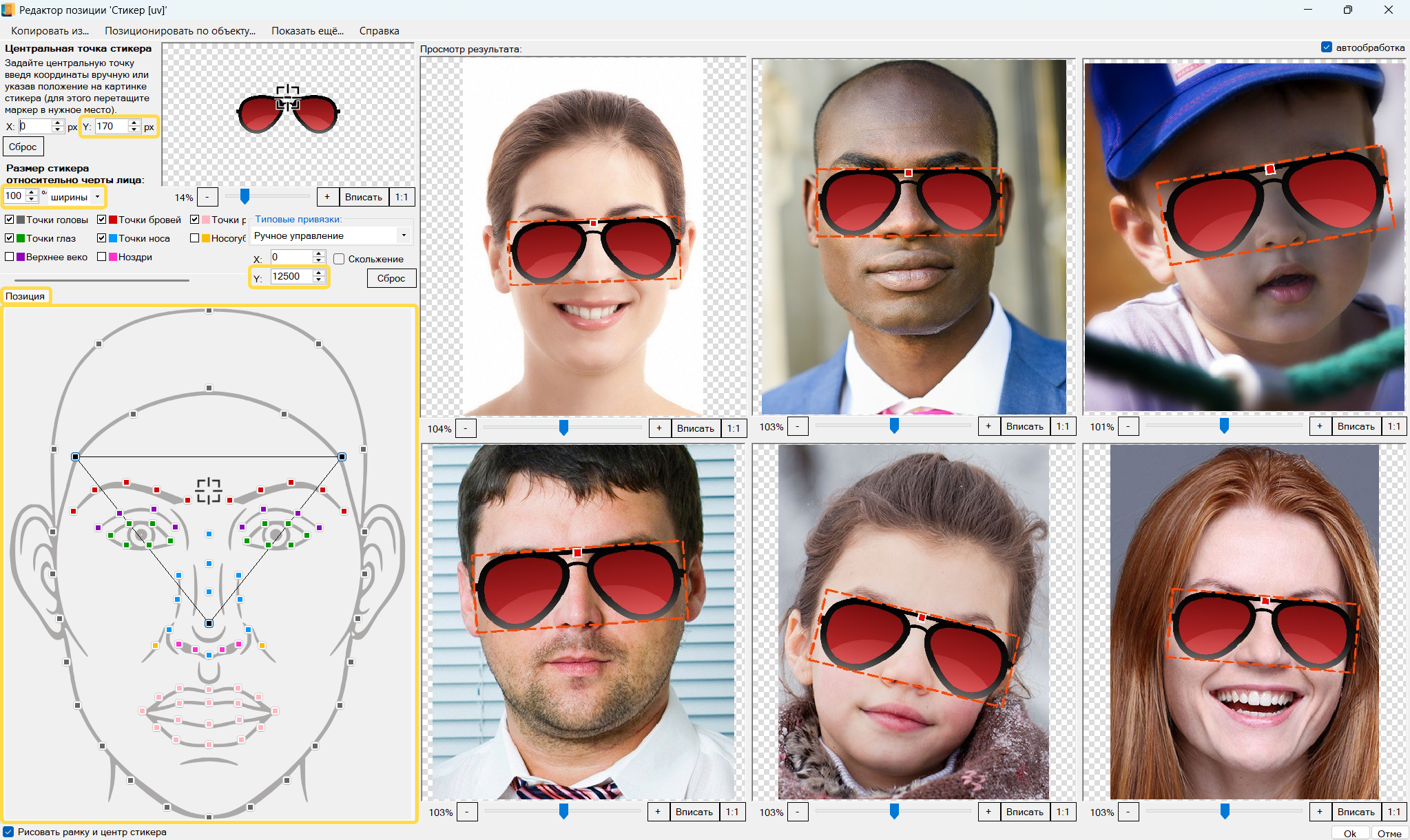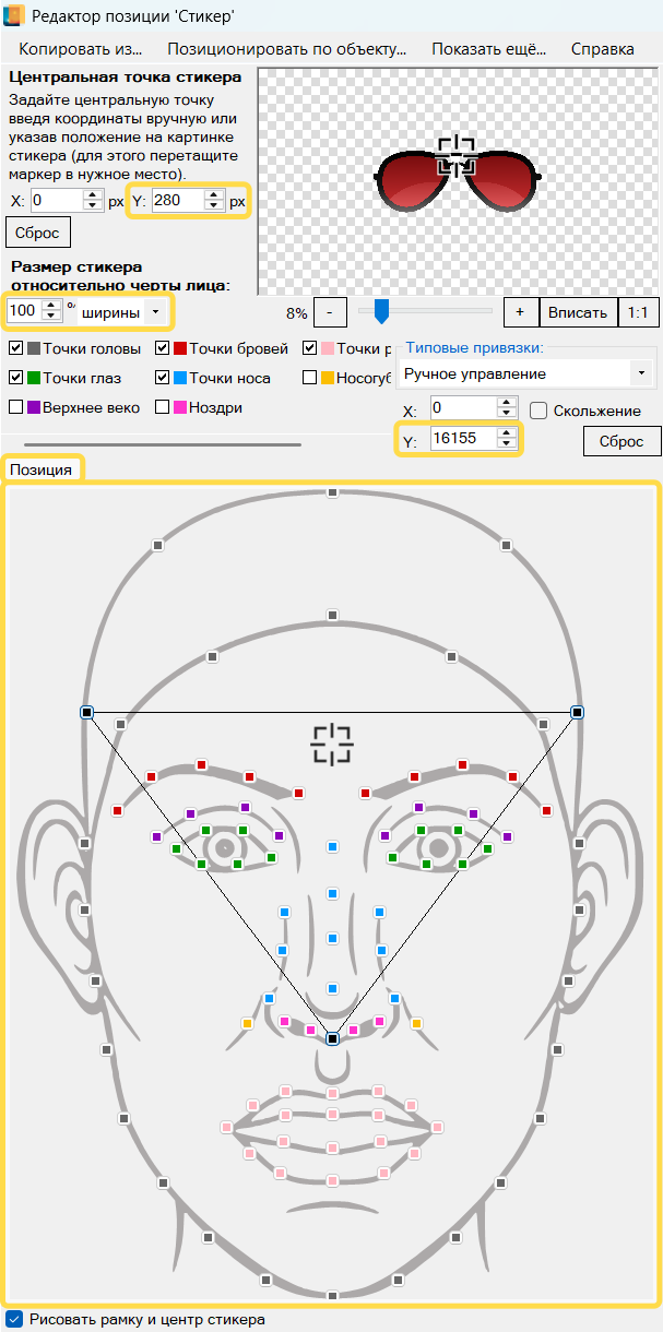 В открывшемся Редакторе позиции задайте настройки стикера: сместите центральную точку стикера на мостик очков, увеличьте размер стикера относительно ширины лица и настройте его позицию на переносице.