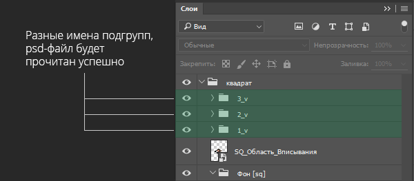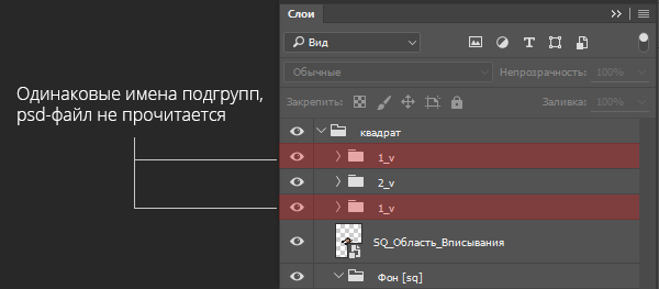 Конструктор шаблонов не сможет перечитать PSD-файл, если на одном уровне содержатся области вписывания, группы или подгруппы слоев с одинаковыми именами. Например, не допускается наличие двух групп слоев с именем квадрат. Аналогично, внутри группы слоев квадрат не может быть подгрупп с одинаковыми именами, например 1_v.