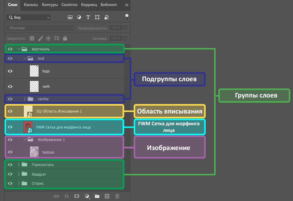 Подгруппа слоев — это слои, которые были сгруппированы в Photoshop. В подгруппы слоев помещаются графические слои и другие элементы.