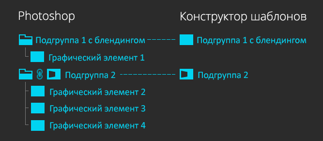 Если внутри подгруппы для каких-либо графических слоев применяются блендинги и маски, то все они будут растеризованы на уровне данной подгруппы. Блендинги и маски, примененные непосредственно к подгруппам слоев, будут перенесены на выгруженные Конструктором шаблонов графические слои.